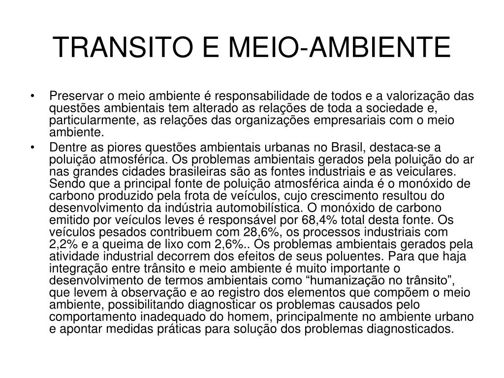 TRANSITO E MEIO-AMBIENTE • Preservar o meio ambiente é responsabilidade de todos e a valorização das questões ambientais tem alterado as relações de toda a sociedade e, particularmente, as relações das organizações empresariais com o meio ambiente. • Dentre as piores questões ambientais urbanas no Brasil, destaca-se a poluição atmosférica. Os problemas ambientais gerados pela poluição do ar nas grandes cidades brasileiras são as fontes industriais e as veiculares. Sendo que a principal fonte de poluição atmosférica ainda é o monóxido de carbono produzido pela frota de veículos, cujo crescimento resultou do desenvolvimento da indústria automobilística. O monóxido de carbono emitido por veículos leves é responsável por 68,4% total desta fonte. Os veículos pesados contribuem com 28,6%, os processos industriais com 2,2% e a queima de lixo com 2,6%.. Os problemas ambientais gerados pela atividade industrial decorrem dos efeitos de seus poluentes. Para que haja integração entre trânsito e meio ambiente é muito importante o desenvolvimento de termos ambientais como “humanização no trânsito”, que levem à observação e ao registro dos elementos que compõem o meio ambiente, possibilitando diagnosticar os problemas causados pelo comportamento inadequado do homem, principalmente no ambiente urbano e apontar medidas práticas para solução dos problemas diagnosticados.