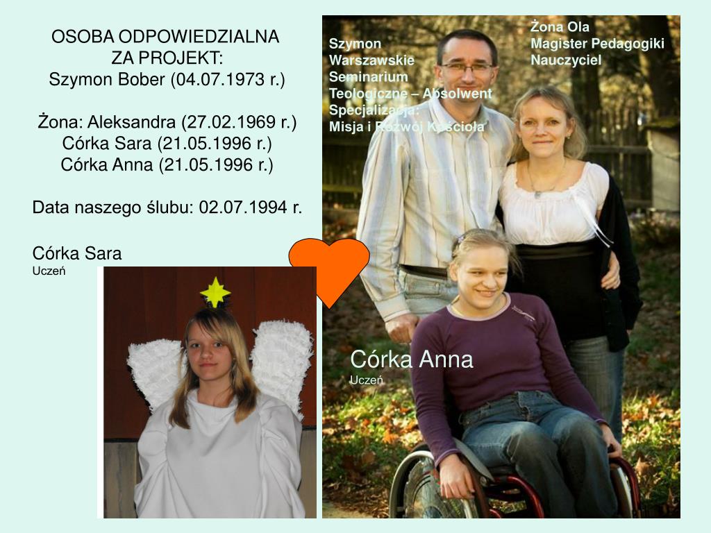 Szymon Warszawskie Seminarium Teologiczne – 3 rok Specjalizacja: Misja i Rozwój Kościoła Żona Ola Magister Pedagogiki Nauczyciel • OSOBA ODPOWIEDZIALNA • ZA PROJEKT: • Szymon Bober (04.07.1973 r.) • Żona: Aleksandra (27.02.1969 r.) • Córka Sara (21.05.1996 r.) • Córka Anna (21.05.1996 r.) • Data naszego ślubu: 02.07.1994 r. ŻONA OLA Magister Pedagogiki Nauczyciel SZYMON Warszawskie Seminarium Teologiczne – 3 rok Specjalizacja: Misja i Rozwój Kościoła Szymon Warszawskie Seminarium Teologiczne – Absolwent Specjalizacja: Misja i Rozwój Kościoła Córka Sara Uczeń Córka Anna Uczeń Córka Anna Uczeń CÓRKA ANIA Uczeń