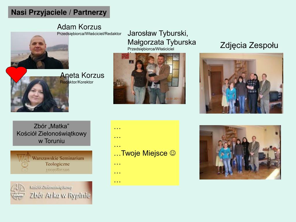 Nasi Przyjaciele / Partnerzy Adam Korzus Przedsiębiorca/Właściciel/Redaktor Jarosław Tyburski, Małgorzata Tyburska Przedsiębiorca/Właściciel Magister prawa Zdjęcia Zespołu Aneta Korzus Redaktor/Korektor … … … …Twoje Miejsce … … … Zbór „Matka” Kościół Zielonoświątkowy w Toruniu