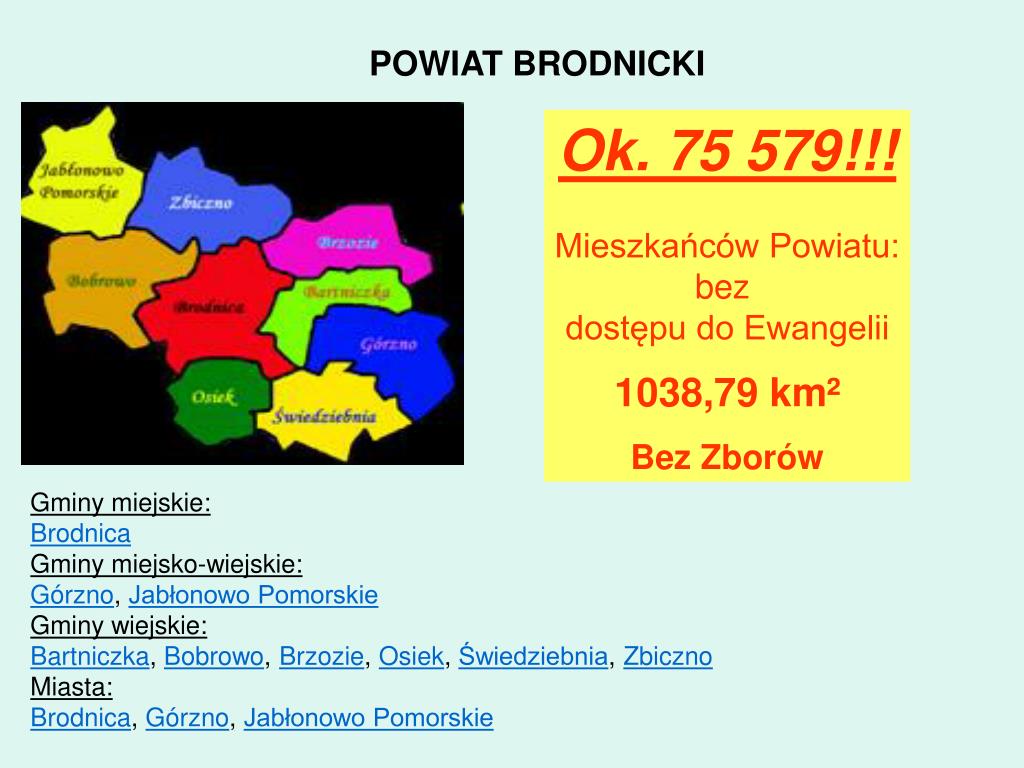 POWIAT BRODNICKI Ok. 75 579!!! Mieszkańców Powiatu: bez dostępu do Ewangelii 1038,79 km² Bez Zborów Gminy miejskie: Brodnica Gminy miejsko-wiejskie: Górzno, Jabłonowo Pomorskie Gminy wiejskie: Bartniczka, Bobrowo, Brzozie, Osiek, Świedziebnia, Zbiczno Miasta: Brodnica, Górzno, Jabłonowo Pomorskie