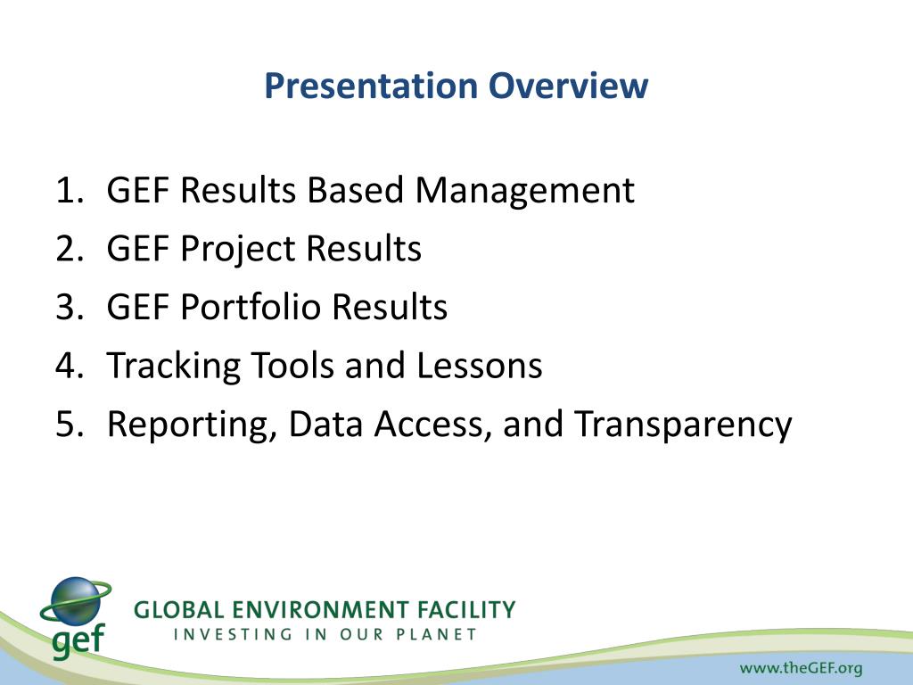 Presentation Overview • GEF Results Based Management • GEF Project Results • GEF Portfolio Results • Tracking Tools and Lessons • Reporting, Data Access, and Transparency