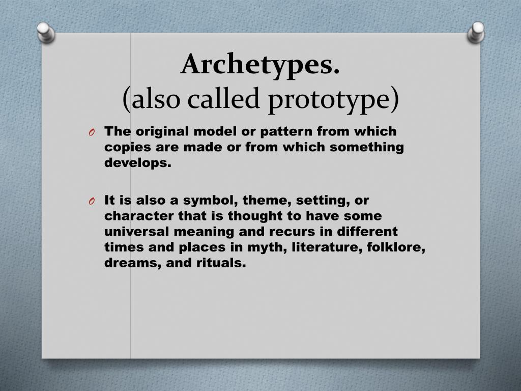 Archetypes. (also called prototype) • The original model or pattern from which copies are made or from which something develops. • It is also a symbol, theme, setting, or character that is thought to have some universal meaning and recurs in different times and places in myth, literature, folklore, dreams, and rituals.