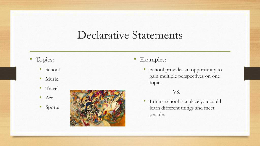 Declarative Statements • Topics: • School • Music • Travel • Art • Sports • Examples: • School provides an opportunity to gain multiple perspectives on one topic. VS. • I think school is a place you could learn different things and meet people.
