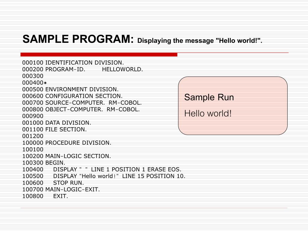 SAMPLE PROGRAM: Displaying the message "Hello world!". 000100 IDENTIFICATION DIVISION. 000200 PROGRAM-ID. HELLOWORLD. 000300 000400* 000500 ENVIRONMENT DIVISION. 000600 CONFIGURATION SECTION. 000700 SOURCE-COMPUTER. RM-COBOL. 000800 OBJECT-COMPUTER. RM-COBOL. 000900 001000 DATA DIVISION. 001100 FILE SECTION. 001200 100000 PROCEDURE DIVISION. 100100 100200 MAIN-LOGIC SECTION. 100300 BEGIN. 100400 DISPLAY " " LINE 1 POSITION 1 ERASE EOS. 100500 DISPLAY "Hello world!" LINE 15 POSITION 10. 100600 STOP RUN. 100700 MAIN-LOGIC-EXIT. 100800 EXIT. Sample Run Hello world!