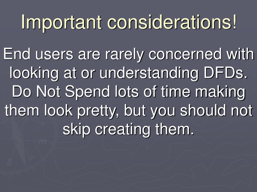 Important considerations! End users are rarely concerned with looking at or understanding DFDs. Do Not Spend lots of time making them look pretty, but you should not skip creating them.