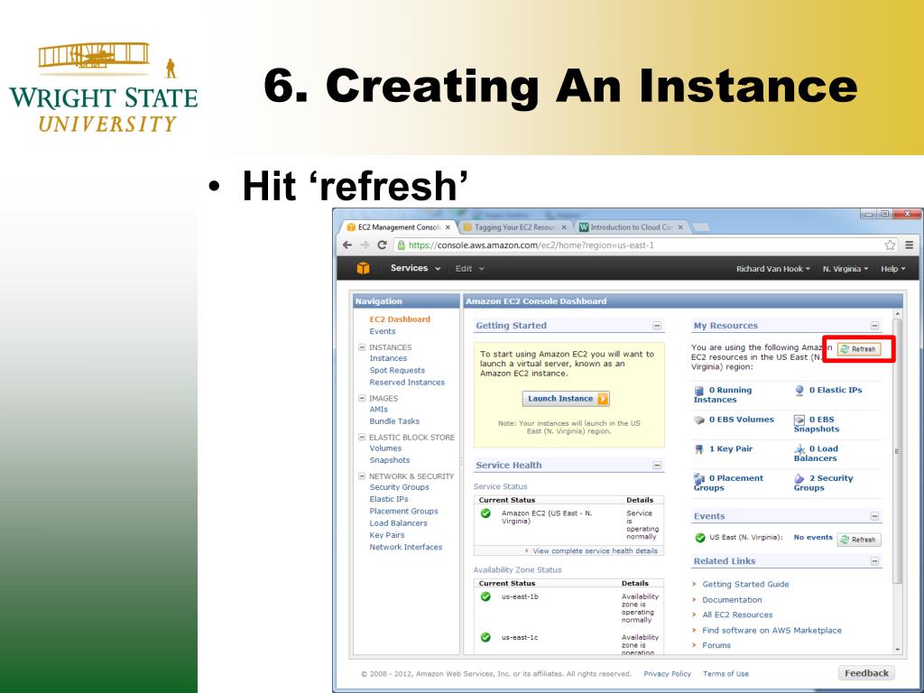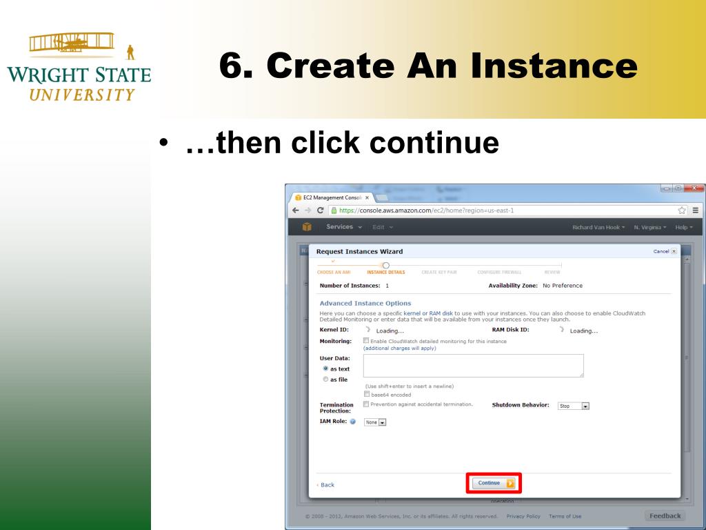 6. Create An Instance • We COULD have selected: • …a particular kernel setup • …a particular ramdisk • For our class, let’s leave those alone for now • Moving on…