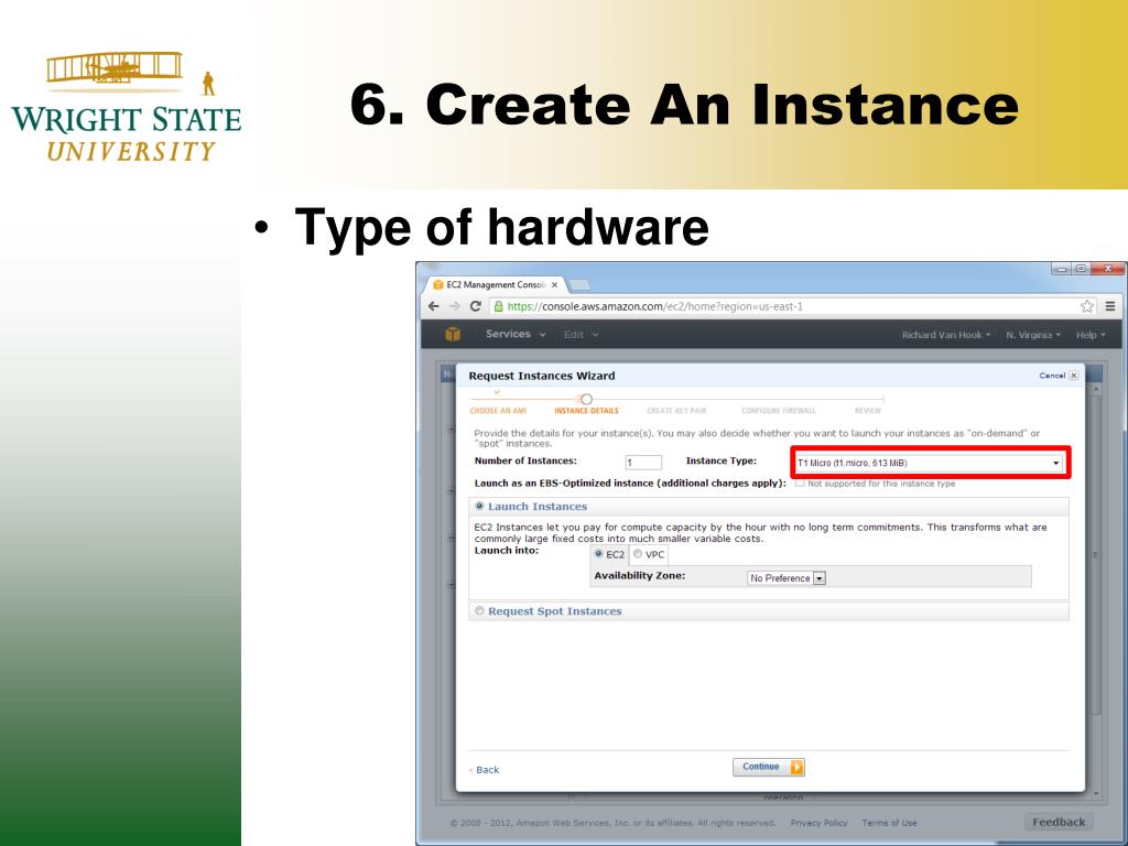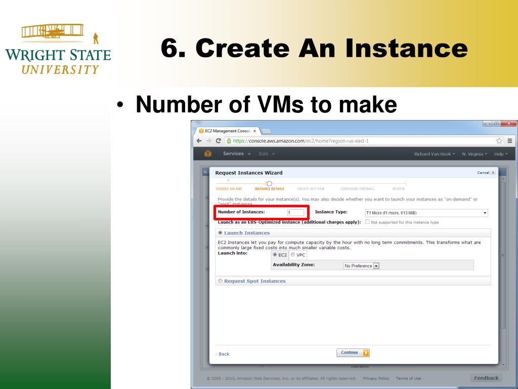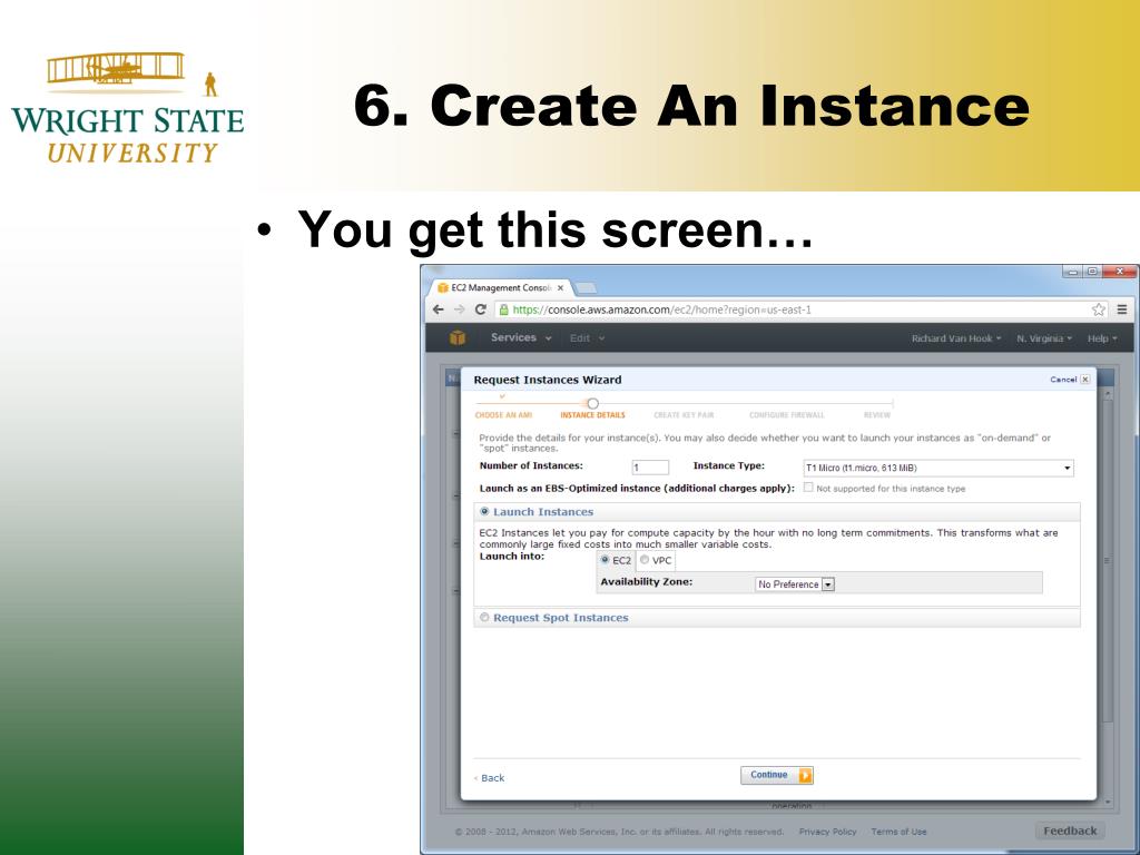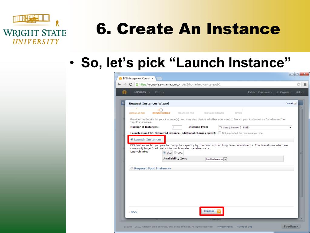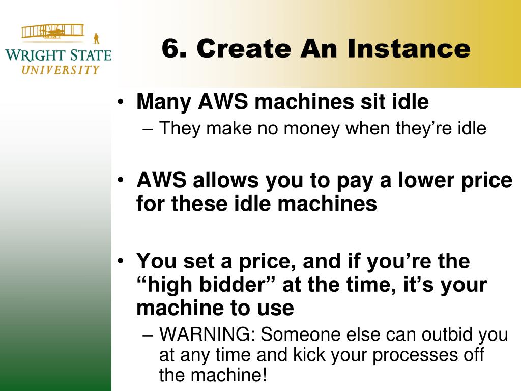 6. Create An Instance • Many AWS machines sit idle • They make no money when they’re idle • AWS allows you to pay a lower price for these idle machines • You set a price, and if you’re the “high bidder” at the time, it’s your machine to use • WARNING: Someone else can outbid you at any time and kick your processes off the machine!