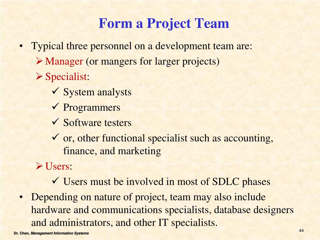 Form a Project Team • Typical three personnel on a development team are: • Manager (or mangers for larger projects) • Specialist: • System analysts • Programmers • Software testers • or, other functional specialist such as accounting, finance, and marketing • Users: • Users must be involved in most of SDLC phases • Depending on nature of project, team may also include hardware and communications specialists, database designers and administrators, and other IT specialists.