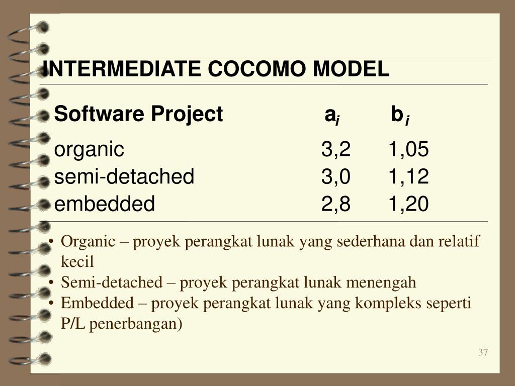 INTERMEDIATE COCOMO MODEL Software Project a b i i organic 3,2 1,05 semi-detached 3,0 1,12 embedded 2,8 1,20 • Organic – proyek perangkat lunak yang sederhana dan relatif kecil • Semi-detached – proyek perangkat lunak menengah • Embedded – proyek perangkat lunak yang kompleks seperti P/L penerbangan)