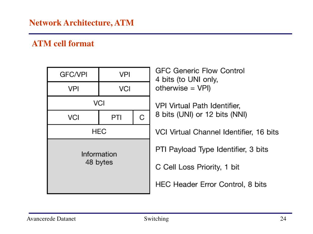 Switching Example of Switching Network types • Line switching • Telex • X.21 (Datex) • PSTN • ISDN • GSM/DCS1800 • Packet switching • X.25 (Datapak) • Frame Relay • IP net • ISDN • Packet Radio • Cell Relay • ATM Switching