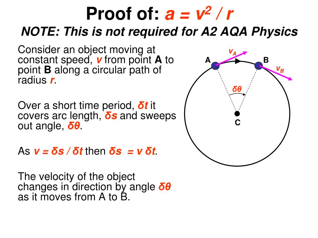 Consider an object moving at constant speed, v from point A to point B along a circular path of radius r. Over a short time period, δt it covers arc length, δs and sweeps out angle, δθ. As v = δs / δt then δs = v δt. The velocity of the object changes in direction by angle δθ as it moves from A to B. vA A B vB δθ C Proof of: a = v2 / rNOTE: This is not required for A2 AQA Physics