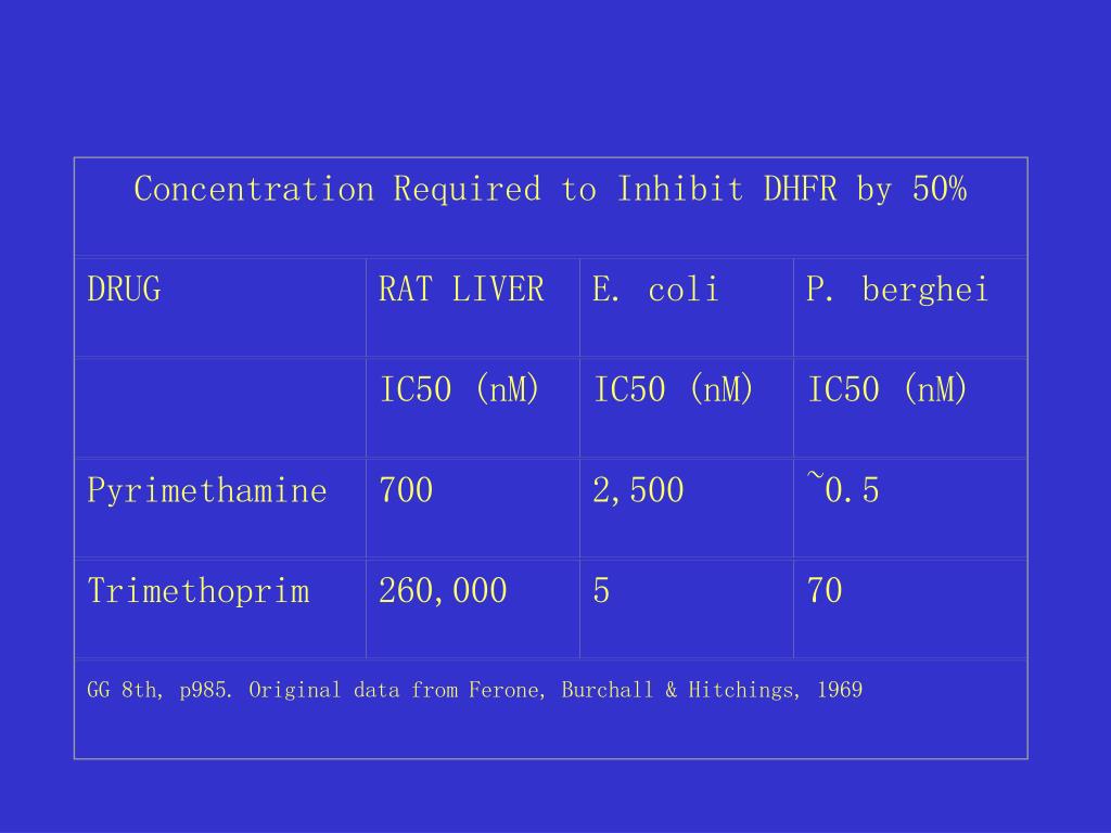 Concentration Required to Inhibit DHFR by 50% DRUG RAT LIVER E. coli P. berghei IC50 (nM) IC50 (nM) IC50 (nM) Pyrimethamine 700 2,500 ~0.5 Trimethoprim 260,000 5 70 GG 8th, p985. Original data from Ferone, Burchall & Hitchings, 1969