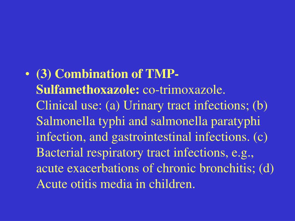 (3) Combination of TMP-Sulfamethoxazole: co-trimoxazole. Clinical use: (a) Urinary tract infections; (b) Salmonella typhi and salmonella paratyphi infection, and gastrointestinal infections. (c) Bacterial respiratory tract infections, e.g., acute exacerbations of chronic bronchitis; (d) Acute otitis media in children.