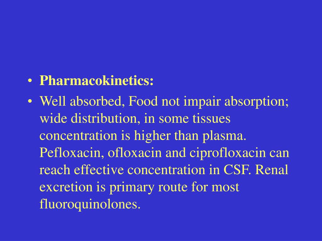 Pharmacokinetics: • Well absorbed, Food not impair absorption; wide distribution, in some tissues concentration is higher than plasma. Pefloxacin, ofloxacin and ciprofloxacin can reach effective concentration in CSF. Renal excretion is primary route for most fluoroquinolones.