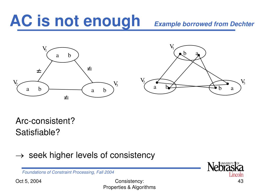Arc consistency 2. AC may discover inconsistency Example borrowed from Dechter Consistency: Properties & Algorithms