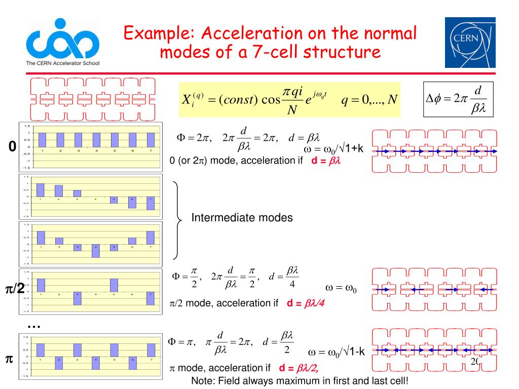 Example: Acceleration on the normal modes of a 7-cell structure 0 w = w0/√1+k 0 (or 2p) mode, acceleration if d = bl Intermediate modes p/2 w = w0 p/2 mode, acceleration if d = bl/4 … w = w0/√1-k p 20 p mode, acceleration if d = bl/2, Note: Field always maximum in first and last cell!