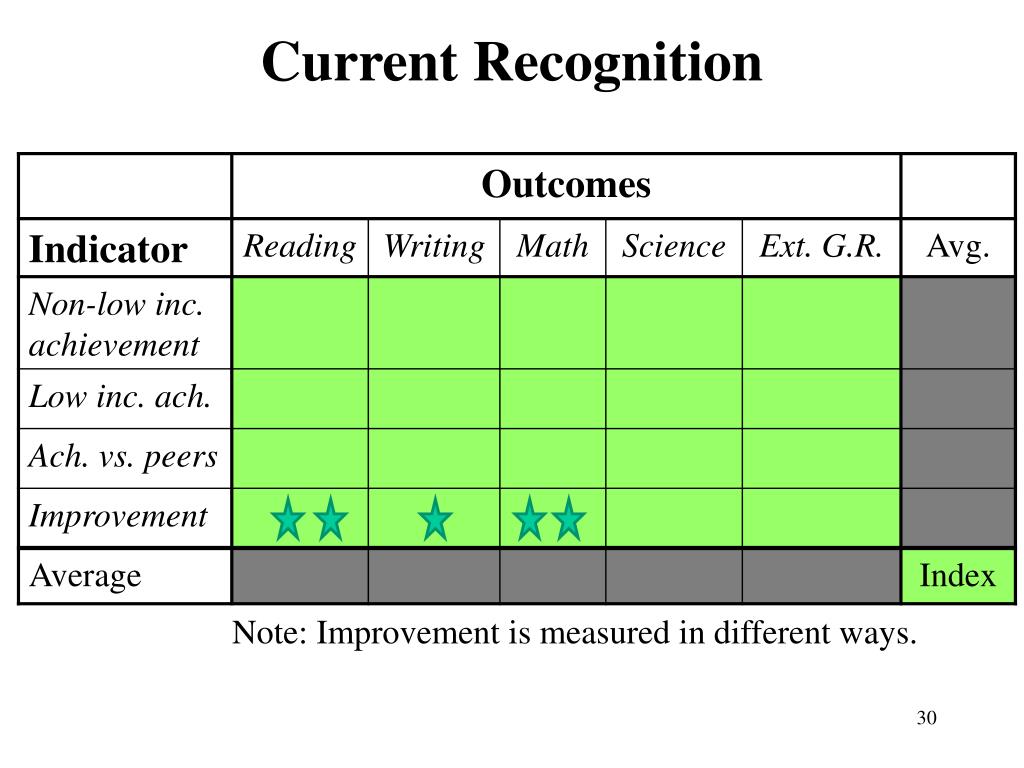 Recognition System • Guiding principles • Multiple ways to demonstrate success, earn recognition • Criterion-based system Theory of Change: People are motivated more by successthan guilt or blame; need clear, challenging, attainable goals • Use same accountability matrix, receive recognition when meeting specific benchmarks • Based on 2-year average