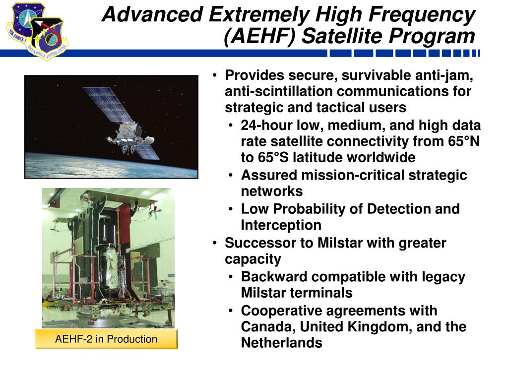 Advanced Extremely High Frequency (AEHF) Satellite Program • Provides secure, survivable anti-jam, anti-scintillation communications for strategic and tactical users • 24-hour low, medium, and high data rate satellite connectivity from 65°N to 65°S latitude worldwide • Assured mission-critical strategic networks • Low Probability of Detection and Interception • Successor to Milstar with greater capacity • Backward compatible with legacy Milstar terminals • Cooperative agreements with Canada, United Kingdom, and the Netherlands AEHF-2 in Production