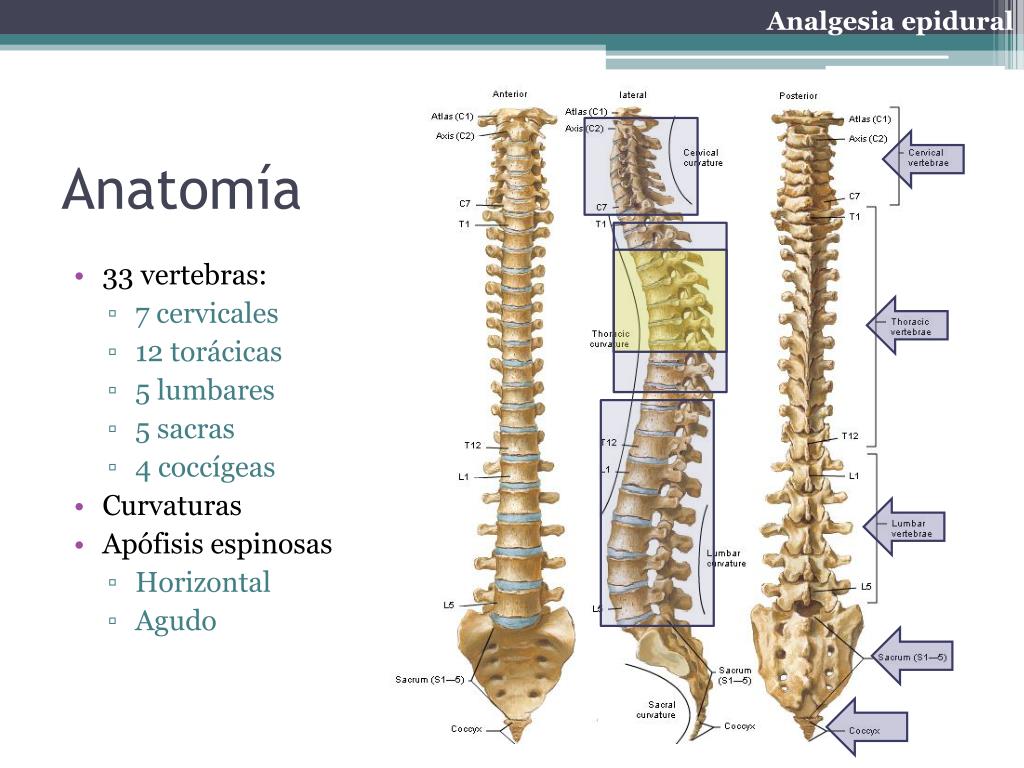 Analgesia epidural Anatomía • 33 vertebras: • 7 cervicales • 12 torácicas • 5 lumbares • 5 sacras • 4 coccígeas • Curvaturas • Apófisis espinosas • Horizontal • Agudo