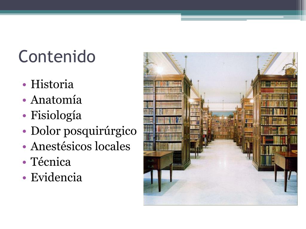 Contenido • Historia • Anatomía • Fisiología • Dolor posquirúrgico • Anestésicos locales • Técnica • Evidencia