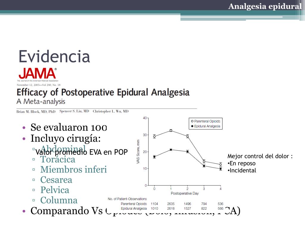 Analgesia epidural Evidencia • Se evaluaron 100 estudios • Incluyo cirugía: • Abdominal • Torácica • Miembros inferiores • Cesarea • Pelvica • Columna • Comparando Vs Opiodes (Bolo, Infusion, PCA) Valor promedio EVA en POP • Mejor control del dolor : • En reposo • Incidental