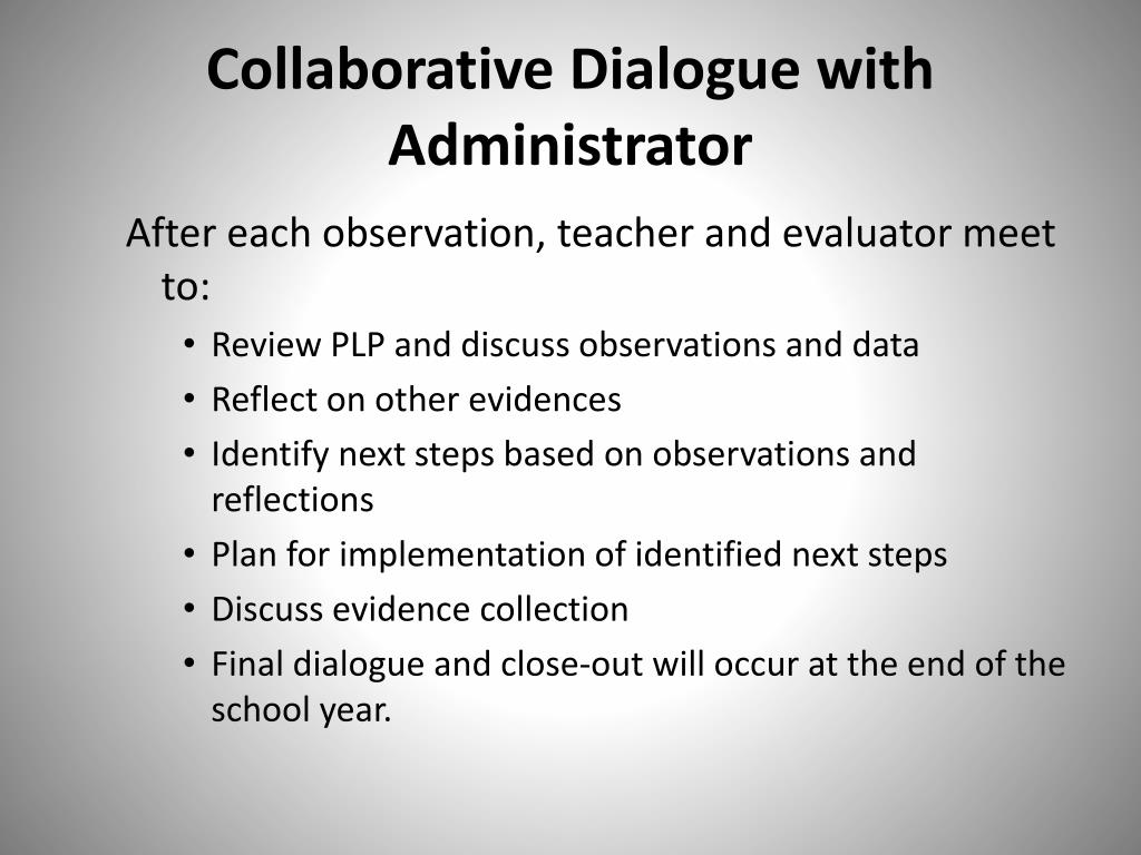Collaborative Dialogue with Administrator After each observation, teacher and evaluator meet to: • Review PLP and discuss observations and data • Reflect on other evidences • Identify next steps based on observations and reflections • Plan for implementation of identified next steps • Discuss evidence collection • Final dialogue and close-out will occur at the end of the school year.