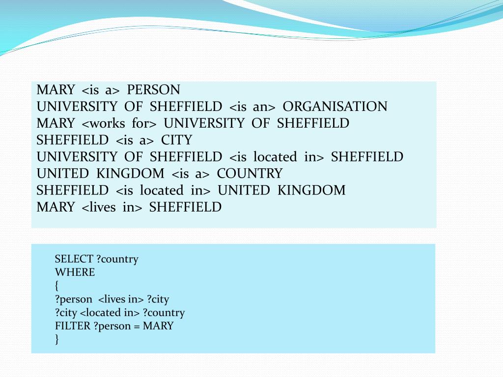 MARY <is a> PERSON UNIVERSITY OF SHEFFIELD <is an> ORGANISATION MARY <works for> UNIVERSITY OF SHEFFIELD SHEFFIELD <is a> CITY UNIVERSITY OF SHEFFIELD <is located in> SHEFFIELD UNITED KINGDOM <is a> COUNTRY SHEFFIELD <is located in> UNITED KINGDOM MARY <lives in> SHEFFIELD SELECT ?country WHERE { ?person <lives in> ?city ?city <located in> ?country • FILTER ?person = MARY }