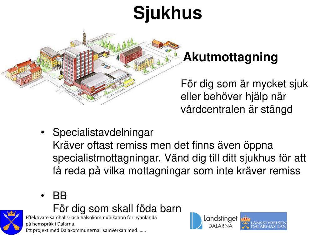 Sjukhus Akutmottagning För dig som är mycket sjuk eller behöver hjälp när vårdcentralen är stängd • SpecialistavdelningarKräver oftast remiss men det finns även öppna specialistmottagningar. Vänd dig till ditt sjukhus för att få reda på vilka mottagningar som inte kräver remiss • BBFör dig som skall föda barn Effektivare samhälls- och hälsokommunikation för nyanlända på hemspråk i Dalarna. Ett projekt med Dalakommunerna i samverkan med…….