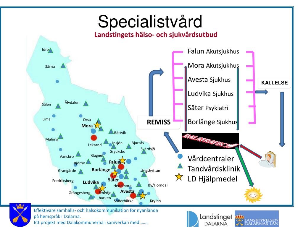 Specialistvård Landstingets hälso- och sjukvårdsutbud • Falun Akutsjukhus • Mora Akutsjukhus • Avesta Sjukhus • Ludvika Sjukhus • Säter Psykiatri • Borlänge Sjukhus • Vårdcentraler • TandvårdsklinikLD Hjälpmedel Idre Särna KALLELSE Älvdalen Sälen Lima Orsa REMISS Mora Rättvik Malung Insjön Bjursås Leksand Svärdsjö Grycksbo Gagnef Vansbro Falun Björbo Borlänge Grangärde Långshyttan Säter Fredriksberg Ludvika By/Horndal Hedemora Avesta Grängesberg Smedje- backen Söderbärke Krylbo Effektivare samhälls- och hälsokommunikation för nyanlända på hemspråk i Dalarna. Ett projekt med Dalakommunerna i samverkan med…….