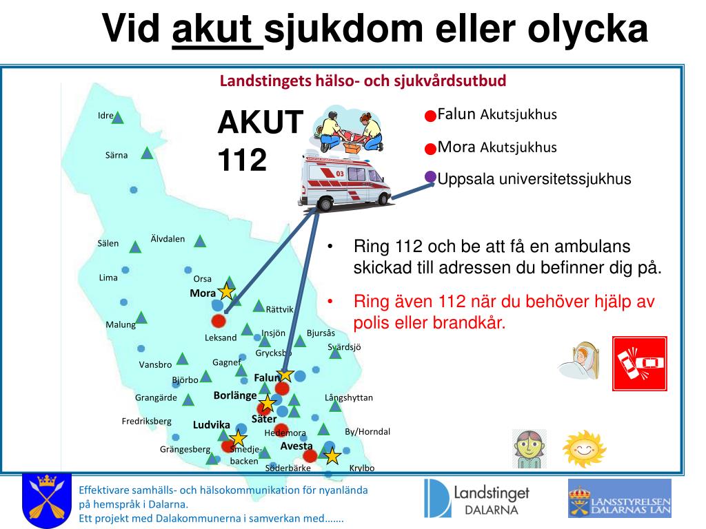 Om du blir akut sjuk! • Ring 112 och be att få en ambulans skickad till adressen du befinner dig på. • Ring även 112 när du behöver • hjälp av polis eller brandkår. Effektivare samhälls- och hälsokommunikation för nyanlända på hemspråk i Dalarna. Ett projekt med Dalakommunerna i samverkan med…….