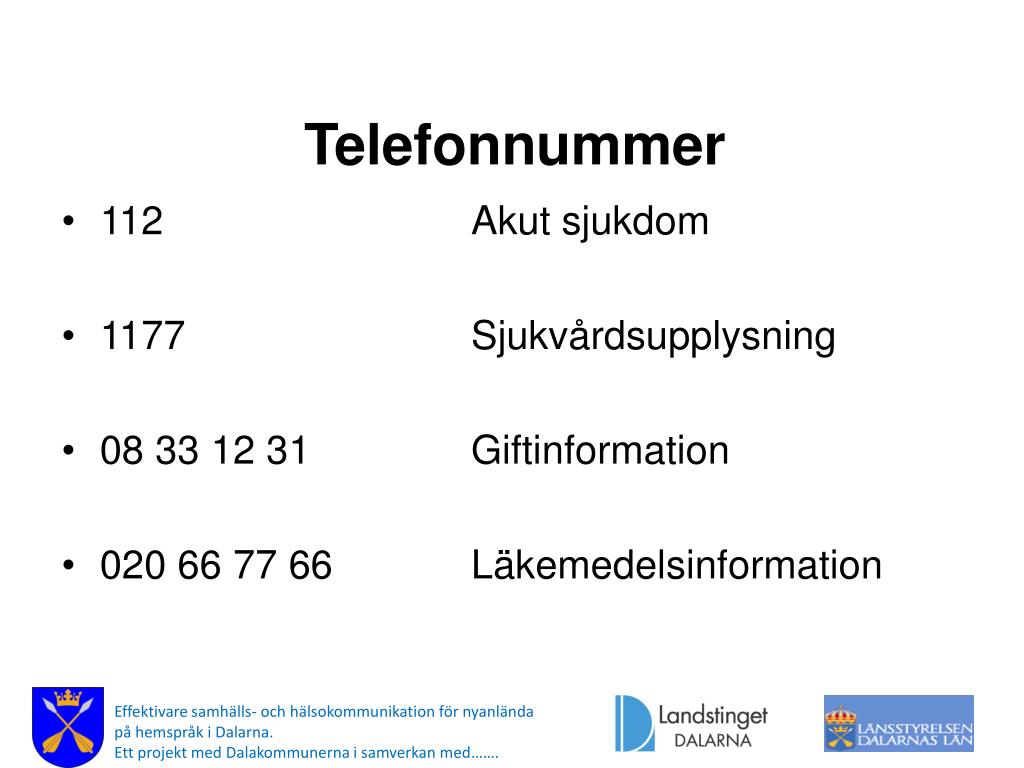 Telefonnummer • 112 Akut sjukdom • 1177 Sjukvårdsupplysning • 08 33 12 31 Giftinformation • 020 66 77 66 Läkemedelsinformation Effektivare samhälls- och hälsokommunikation för nyanlända på hemspråk i Dalarna. Ett projekt med Dalakommunerna i samverkan med…….