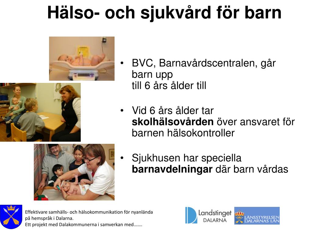 Hälso- och sjukvård för barn • BVC, Barnavårdscentralen, går barn upp till 6 års ålder till • Vid 6 års ålder tar skolhälsovården över ansvaret för barnen hälsokontroller • Sjukhusen har speciella barnavdelningar där barn vårdas Effektivare samhälls- och hälsokommunikation för nyanlända på hemspråk i Dalarna. Ett projekt med Dalakommunerna i samverkan med…….