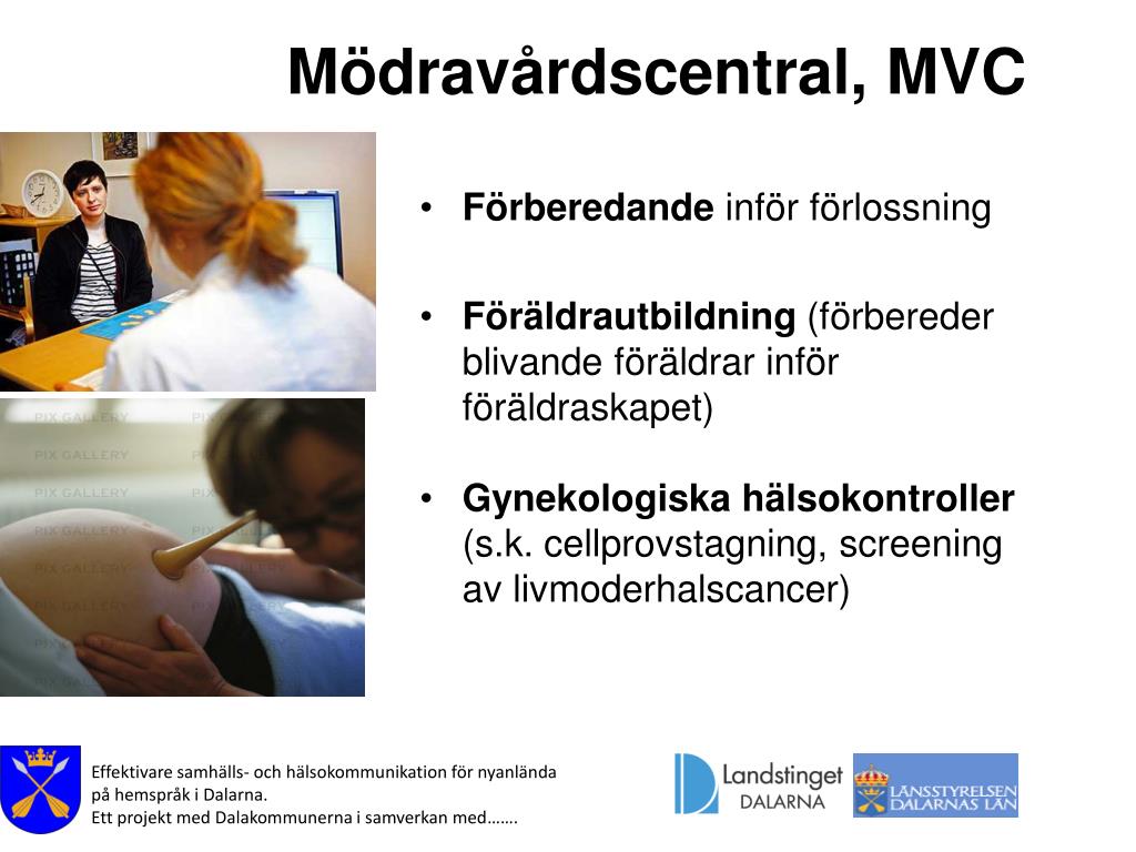 Mödravårdscentral, MVC • Förberedande inför förlossning • Föräldrautbildning (förbereder blivande föräldrar inför föräldraskapet) • Gynekologiska hälsokontroller (s.k. cellprovstagning, screening av livmoderhalscancer) Effektivare samhälls- och hälsokommunikation för nyanlända på hemspråk i Dalarna. Ett projekt med Dalakommunerna i samverkan med…….
