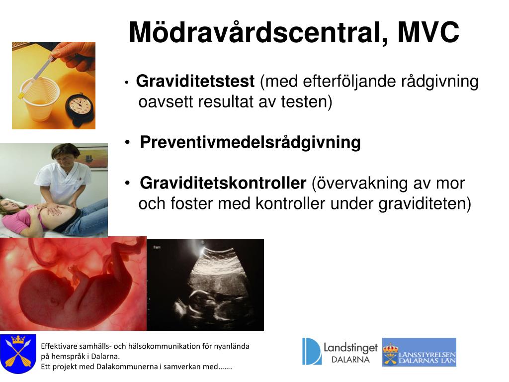 Mödravårdscentral, MVC • Graviditetstest (med efterföljande rådgivning oavsett resultat av testen) • Preventivmedelsrådgivning • Graviditetskontroller (övervakning av mor • och foster med kontroller under graviditeten) Effektivare samhälls- och hälsokommunikation för nyanlända på hemspråk i Dalarna. Ett projekt med Dalakommunerna i samverkan med…….