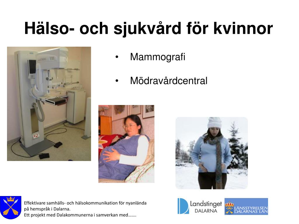 Hälso- och sjukvård för kvinnor • Mammografi • Mödravårdcentral Effektivare samhälls- och hälsokommunikation för nyanlända på hemspråk i Dalarna. Ett projekt med Dalakommunerna i samverkan med…….