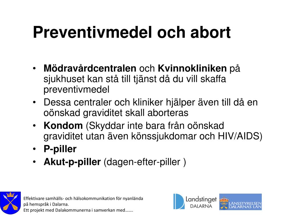 Preventivmedel och abort • Mödravårdcentralen och Kvinnokliniken på sjukhuset kan stå till tjänst då du vill skaffa preventivmedel • Dessa centraler och kliniker hjälper även till då en oönskad graviditet skall aborteras • Kondom (Skyddar inte bara från oönskad graviditet utan även könssjukdomar och HIV/AIDS) • P-piller • Akut-p-piller (dagen-efter-piller ) Effektivare samhälls- och hälsokommunikation för nyanlända på hemspråk i Dalarna. Ett projekt med Dalakommunerna i samverkan med…….