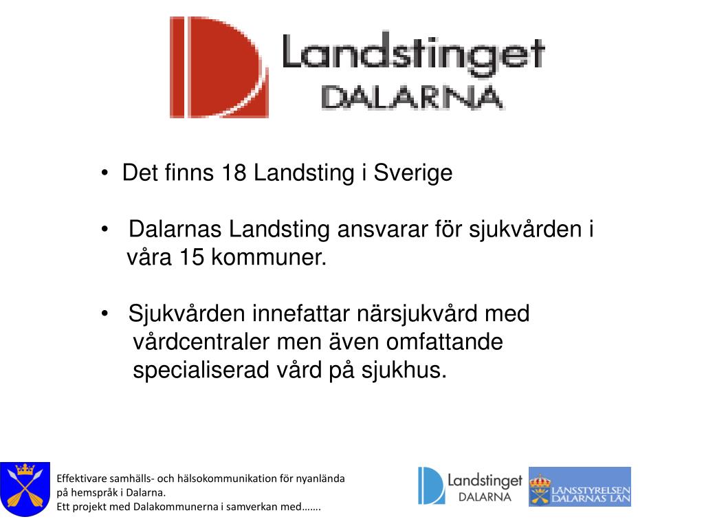 Det finns 18 Landsting i Sverige • Dalarnas Landsting ansvarar för sjukvården i • våra 15 kommuner. • Sjukvården innefattar närsjukvård med • vårdcentraler men även omfattande • specialiserad vård på sjukhus. Effektivare samhälls- och hälsokommunikation för nyanlända på hemspråk i Dalarna. Ett projekt med Dalakommunerna i samverkan med…….