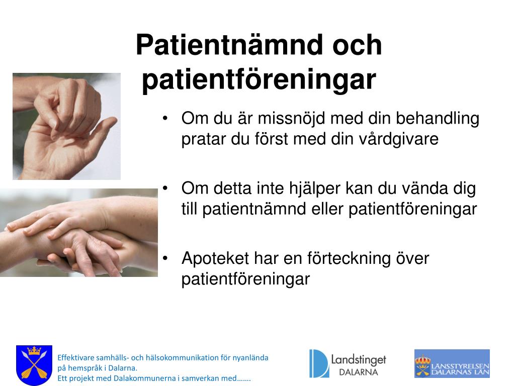 Patientnämnd och patientföreningar • Om du är missnöjd med din behandling pratar du först med din vårdgivare • Om detta inte hjälper kan du vända dig till patientnämnd eller patientföreningar • Apoteket har en förteckning över patientföreningar Effektivare samhälls- och hälsokommunikation för nyanlända på hemspråk i Dalarna. Ett projekt med Dalakommunerna i samverkan med…….
