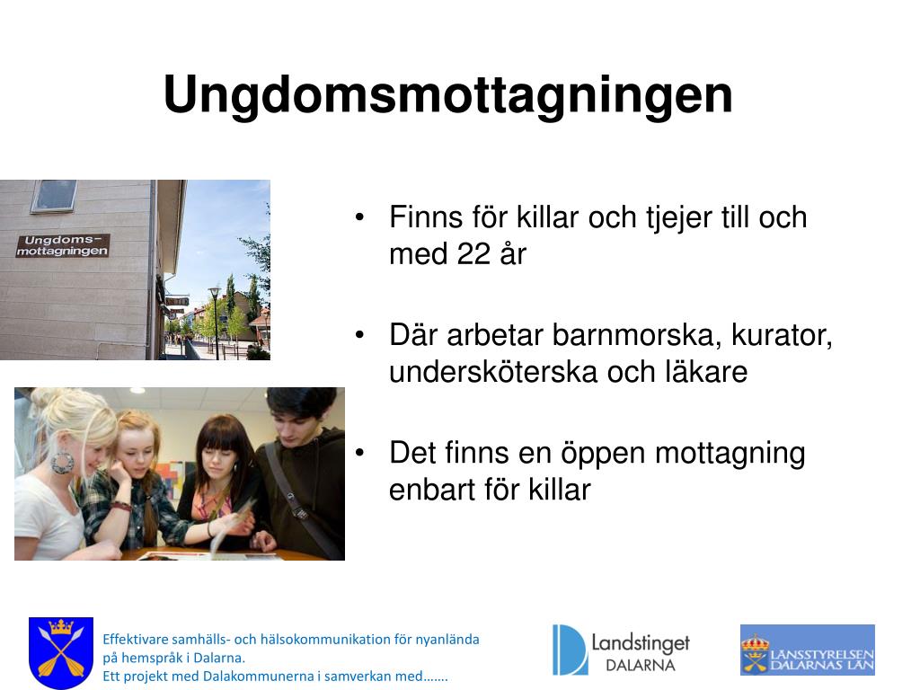 Ungdomsmottagningen • Finns för killar och tjejer till och med 22 år • Där arbetar barnmorska, kurator, undersköterska och läkare • Det finns en öppen mottagning enbart för killar Effektivare samhälls- och hälsokommunikation för nyanlända på hemspråk i Dalarna. Ett projekt med Dalakommunerna i samverkan med…….