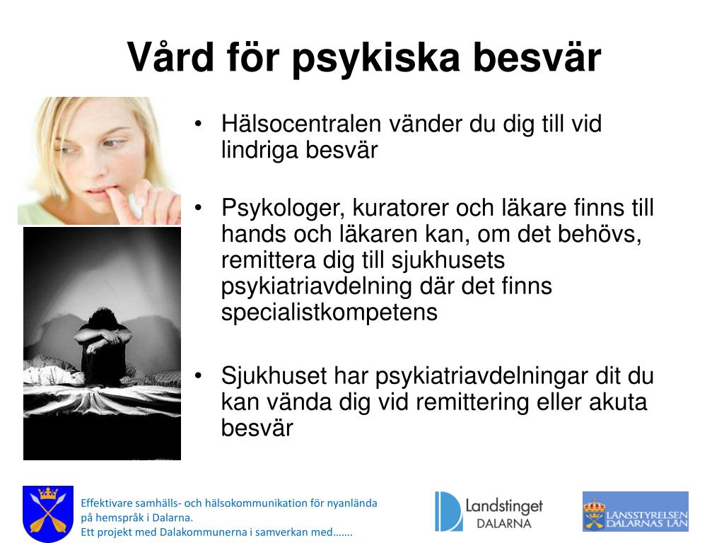 Vård för psykiska besvär • Hälsocentralen vänder du dig till vid lindriga besvär • Psykologer, kuratorer och läkare finns till hands och läkaren kan, om det behövs, remittera dig till sjukhusets psykiatriavdelning där det finns specialistkompetens • Sjukhuset har psykiatriavdelningar dit du kan vända dig vid remittering eller akuta besvär Effektivare samhälls- och hälsokommunikation för nyanlända på hemspråk i Dalarna. Ett projekt med Dalakommunerna i samverkan med…….