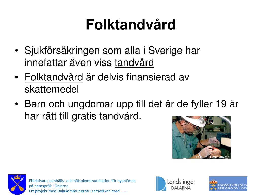 Foto: multimediabyrån Folktandvård • Sjukförsäkringen som alla i Sverige har innefattar även viss tandvård • Folktandvård är delvis finansierad av skattemedel • Barn och ungdomar upp till det år de fyller 19 år har rätt till gratis tandvård. Effektivare samhälls- och hälsokommunikation för nyanlända på hemspråk i Dalarna. Ett projekt med Dalakommunerna i samverkan med…….