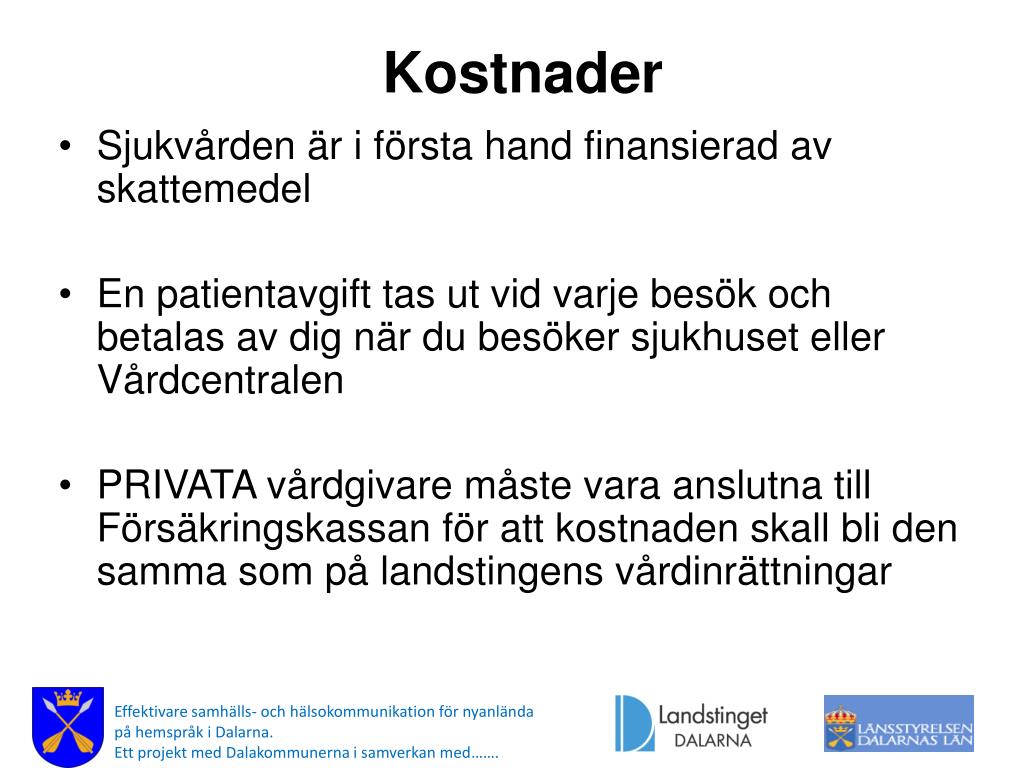 Kostnader • Sjukvården är i första hand finansierad av skattemedel • En patientavgift tas ut vid varje besök och betalas av dig när du besöker sjukhuset eller Vårdcentralen • PRIVATA vårdgivare måste vara anslutna till Försäkringskassan för att kostnaden skall bli den samma som på landstingens vårdinrättningar Effektivare samhälls- och hälsokommunikation för nyanlända på hemspråk i Dalarna. Ett projekt med Dalakommunerna i samverkan med…….