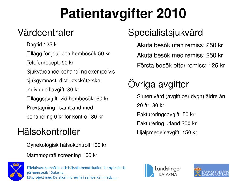 Patientavgifter 2010 VårdcentralerDagtid 125 kr Tillägg för jour och hembesök 50 kr Telefonrecept: 50 kr Sjukvårdande behandling exempelvis sjukgymnast, distriktssköterska individuell avgift :80 kr Tilläggsavgift vid hembesök: 50 kr Provtagning i samband med behandling 0 kr för kontroll 80 kr Hälsokontroller Gynekologisk hälsokontroll 100 kr Mammografi screening 100 kr Specialistsjukvård Akuta besök utan remiss: 250 kr Akuta besök med remiss: 250 kr Första besök efter remiss: 125 kr Övriga avgifter Sluten vård (avgift per dygn) äldre än 20 år: 80 kr Faktureringsavgift 50 kr Fakturering utland 200 kr Hjälpmedelsavgift 150 kr Effektivare samhälls- och hälsokommunikation för nyanlända på hemspråk i Dalarna. Ett projekt med Dalakommunerna i samverkan med…….