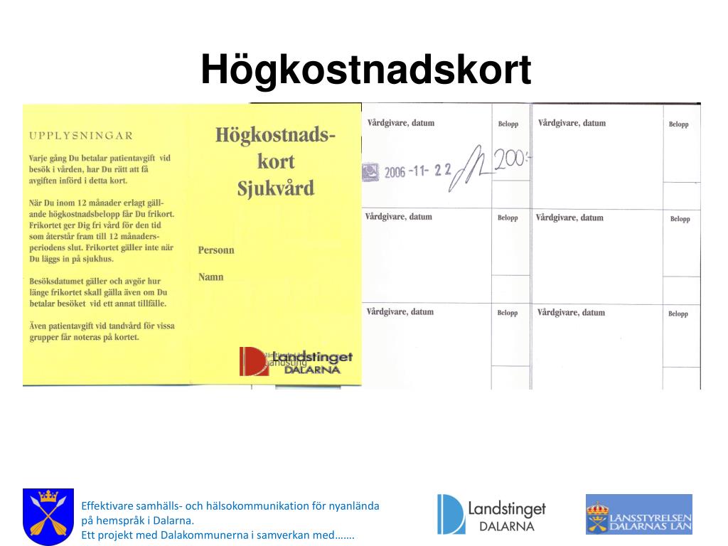 Högkostnadskort Effektivare samhälls- och hälsokommunikation för nyanlända på hemspråk i Dalarna. Ett projekt med Dalakommunerna i samverkan med…….