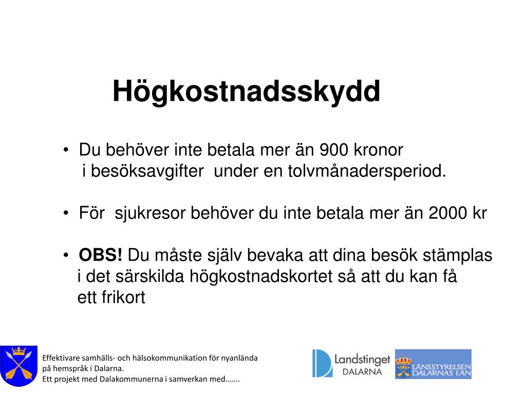 Högkostnadsskydd • Du behöver inte betala mer än 900 kronor • i besöksavgifter under en tolvmånadersperiod. • För sjukresor behöver du inte betala mer än 2000 kr • OBS! Du måste själv bevaka att dina besök stämplas • i det särskilda högkostnadskortet så att du kan få • ett frikort Effektivare samhälls- och hälsokommunikation för nyanlända på hemspråk i Dalarna. Ett projekt med Dalakommunerna i samverkan med…….