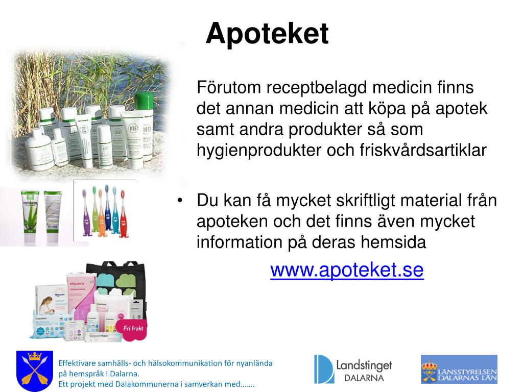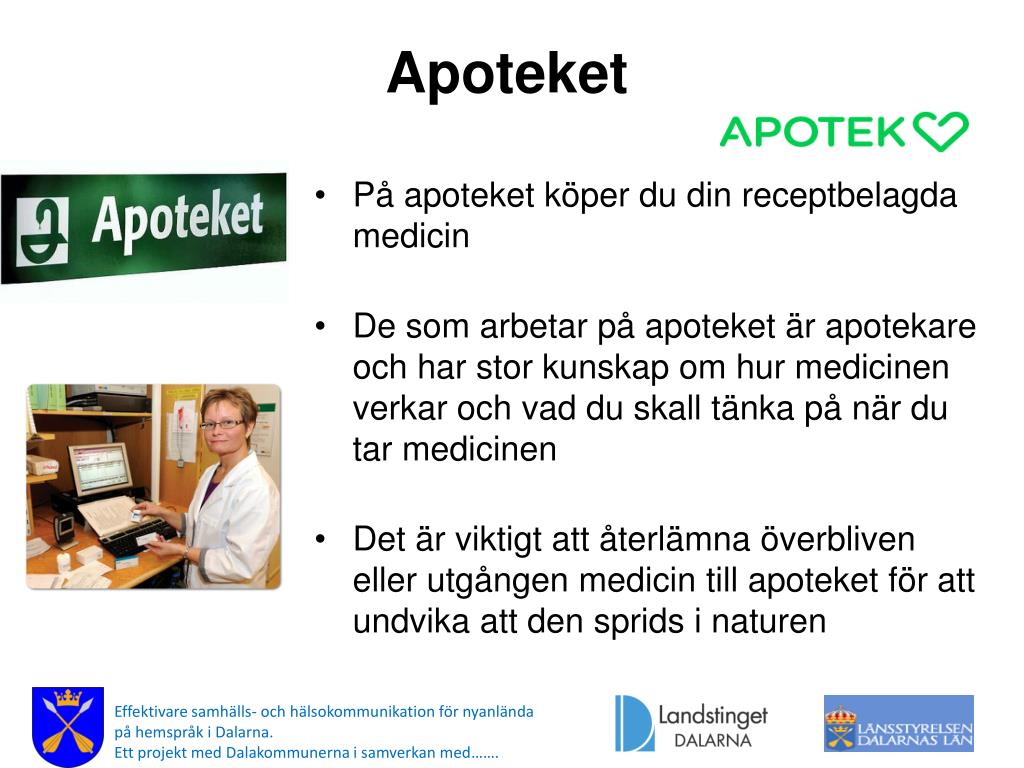 Apoteket • På apoteket köper du din receptbelagda medicin • De som arbetar på apoteket är apotekare och har stor kunskap om hur medicinen verkar och vad du skall tänka på när du tar medicinen • Det är viktigt att återlämna överbliven eller utgången medicin till apoteket för att undvika att den sprids i naturen Effektivare samhälls- och hälsokommunikation för nyanlända på hemspråk i Dalarna. Ett projekt med Dalakommunerna i samverkan med…….