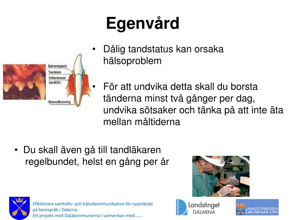 Foto: multimediabyrån Egenvård • Dålig tandstatus kan orsaka hälsoproblem • För att undvika detta skall du borsta tänderna minst två gånger per dag, undvika sötsaker och tänka på att inte äta mellan måltiderna • Du skall även gå till tandläkaren • regelbundet, helst en gång per år Effektivare samhälls- och hälsokommunikation för nyanlända på hemspråk i Dalarna. Ett projekt med Dalakommunerna i samverkan med…….