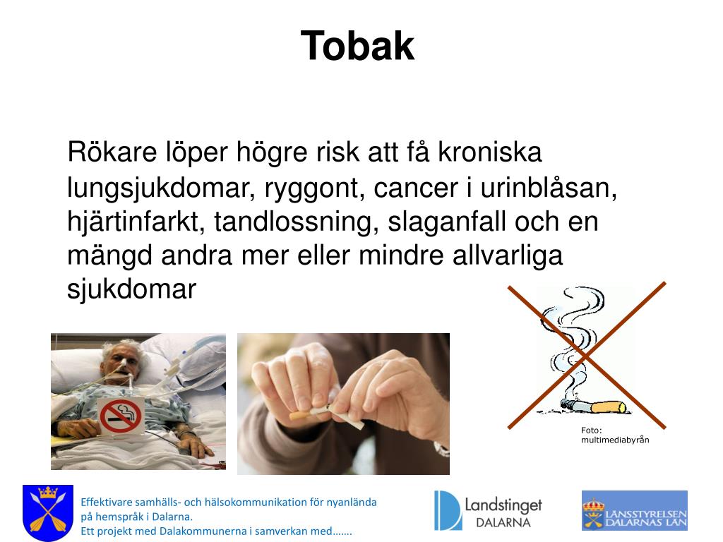 Foto: multimediabyrån Tobak Rökare löper högre risk att få kroniska lungsjukdomar, ryggont, cancer i urinblåsan, hjärtinfarkt, tandlossning, slaganfall och en mängd andra mer eller mindre allvarliga sjukdomar Effektivare samhälls- och hälsokommunikation för nyanlända på hemspråk i Dalarna. Ett projekt med Dalakommunerna i samverkan med…….