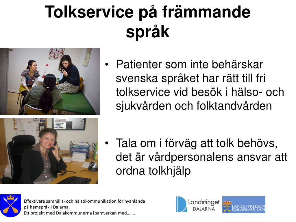 Tolkservice på främmande språk • Patienter som inte behärskar svenska språket har rätt till fri tolkservice vid besök i hälso- och sjukvården och folktandvården • Tala om i förväg att tolk behövs, det är vårdpersonalens ansvar att ordna tolkhjälp Effektivare samhälls- och hälsokommunikation för nyanlända på hemspråk i Dalarna. Ett projekt med Dalakommunerna i samverkan med…….