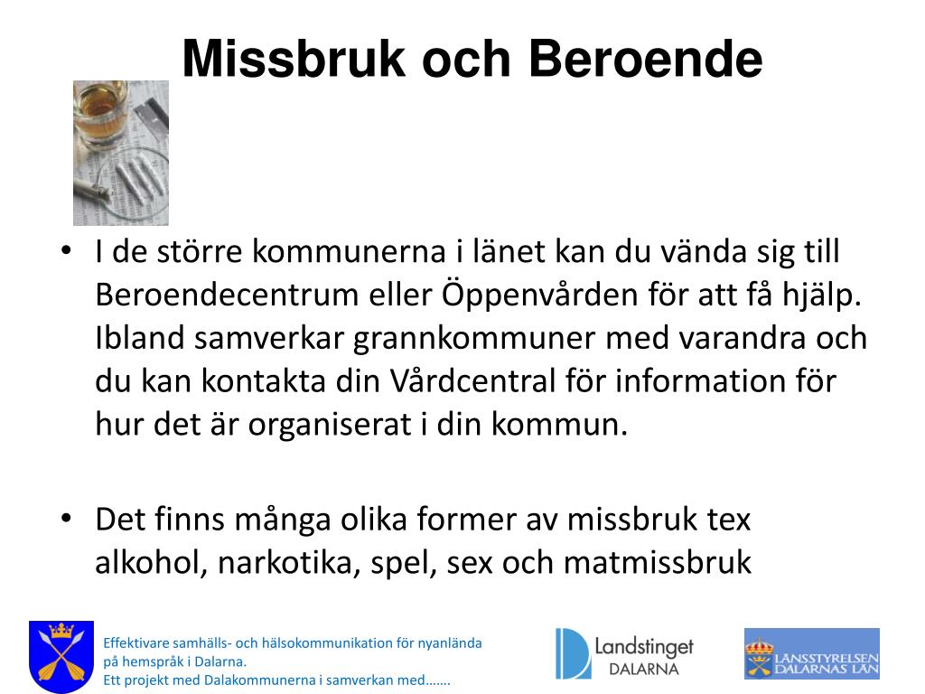 Missbruk och Beroende • I de större kommunerna i länet kan du vända sig till Beroendecentrum eller Öppenvården för att få hjälp. Ibland samverkar grannkommuner med varandra och du kan kontakta din Vårdcentral för information för hur det är organiserat i din kommun. • Det finns många olika former av missbruk tex alkohol, narkotika, spel, sex och matmissbruk Effektivare samhälls- och hälsokommunikation för nyanlända på hemspråk i Dalarna. Ett projekt med Dalakommunerna i samverkan med…….